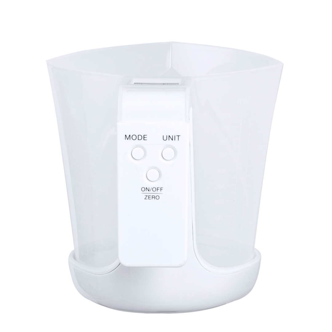 Báscula con jarra medidora integrada, fabricada en resistente combinación de PP y ABS. Pantalla LCD con control por botones y función de tara, con capacidad máxima para 5 kg de peso y válida para medir elementos líquidos o sólidos.Incluye Jarra medidora de 1L de capacidad, con multitud de opciones y vertedor para evitar derrames:-1L, con medidor lateral en tramos de 50 ml.-32 oz, con medidor lateral en tramos de 2 oz. Producto de tipo báscula medidora, pensado para acciones promocionales y uso diario. Este artículo está diseñado para campañas de marca, ferias y regalos corporativos. Destaca por su utilidad práctica y por su buena percepción como soporte publicitario. Permite personalización.