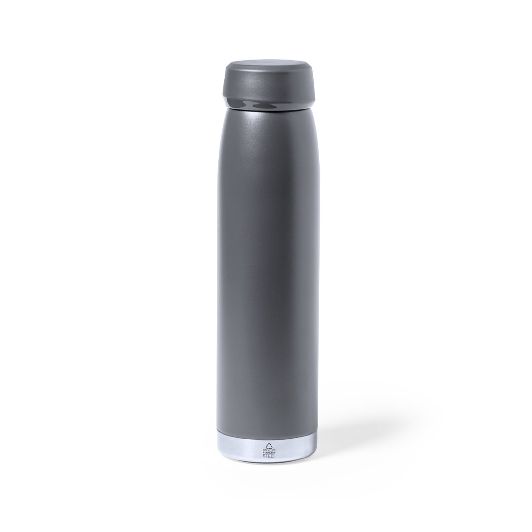 Bidón térmico de 380 ml de capacidad, fabricado en acero inox reciclado de doble pared, con tapón a rosca a juego y base en plata. Disponible en variada gama de colores satinados, libre de BPA y presentado en caja individual de diseño kraft.