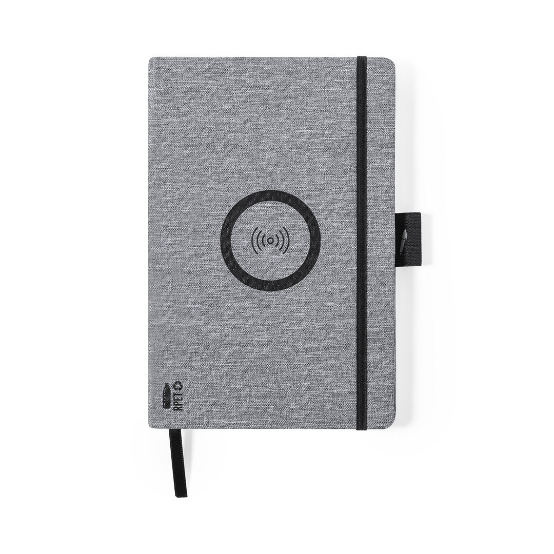 Bloc de notas cargador de línea nature en resistente poliéster 300D RPET de tamaño A5 y elaborado a partir de plástico reciclado, para así fomentar la reutilización de residuos plásticos y ayudar a la sostenibilidad del planeta. Con cargador inalámbrico de 10W integrado en la portada. Producto de tipo bloc notas cargador, pensado para acciones promocionales y uso diario. Este artículo está diseñado para campañas de marca, ferias y regalos corporativos. Destaca por su utilidad práctica y por su buena percepción como soporte publicitario. Permite personalización con logotipo o mensaje, reforzando la visibilidad de la marca. Es una solución versátil que se adapta a diferentes públicos y contextos. Relacionado con.