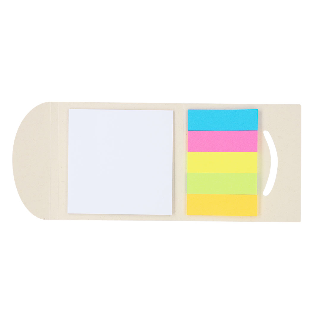Bloc de notas con cubiertas fabricadas en cartones de leche reciclados. Con tapas blandas e interior con 50 notas adhesivas cuadradas y 125 mininotas adhesivas en varios colores. Producto de tipo bloc notas, pensado para acciones promocionales y uso diario.