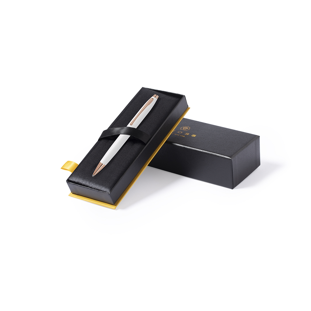 Bolígrafo Cross con mecanismo retráctil, de distinguido diseño bicolor blanco con elegantes toques de oro rosa. Cuerpo metálico en suave acabado y original clip con logotipo. Producto de tipo bolígrafo, pensado para acciones promocionales y uso diario. Este artículo está diseñado para campañas de marca, ferias y regalos corporativos. Destaca por su utilidad práctica y por su buena percepción como soporte publicitario. Permite personalización con logotipo o mensaje, reforzando la visibilidad de la marca. Es una solución versátil que se adapta a diferentes públicos y contextos. Relacionado con los términos: Bolígrafo, cross, Escritura, Marcas.
