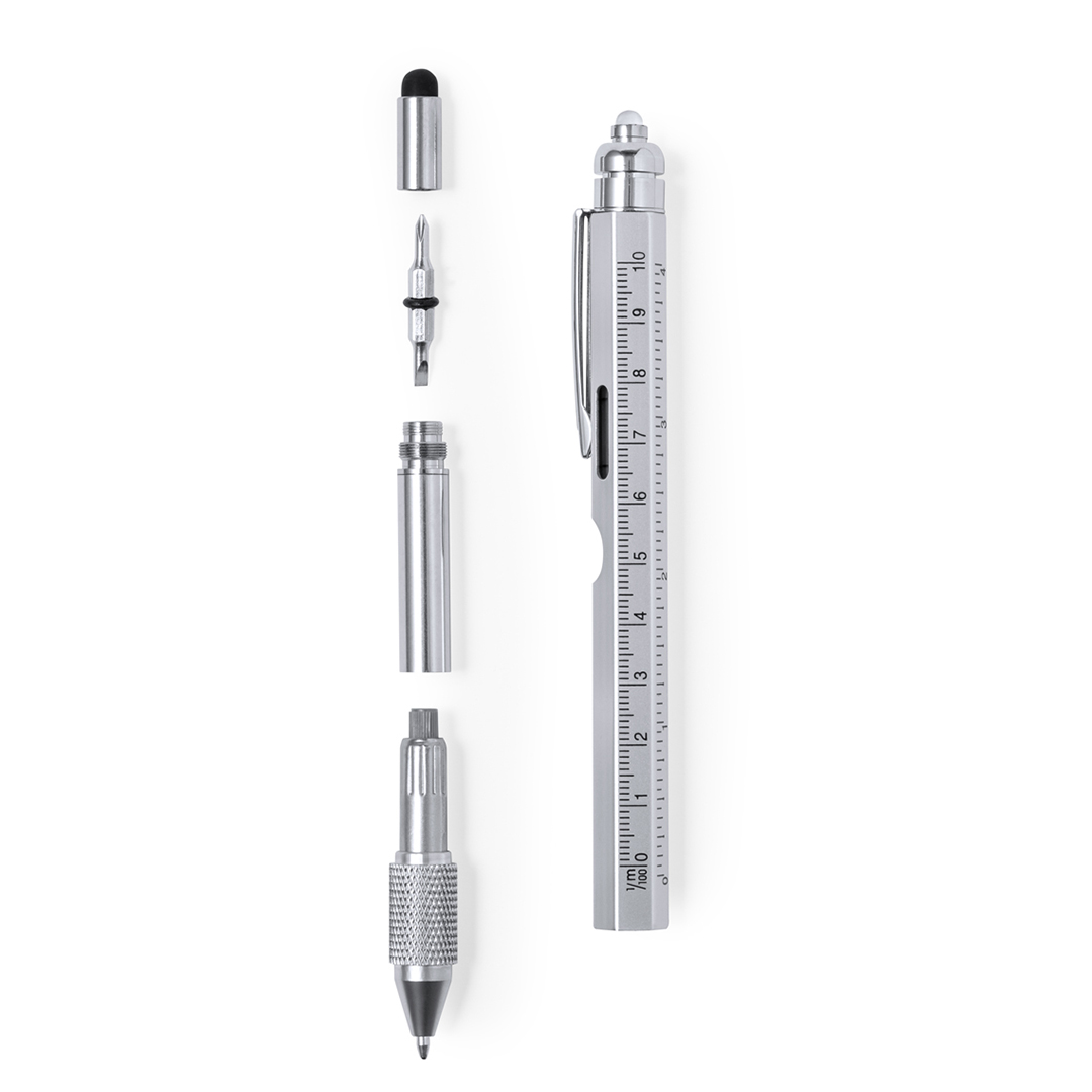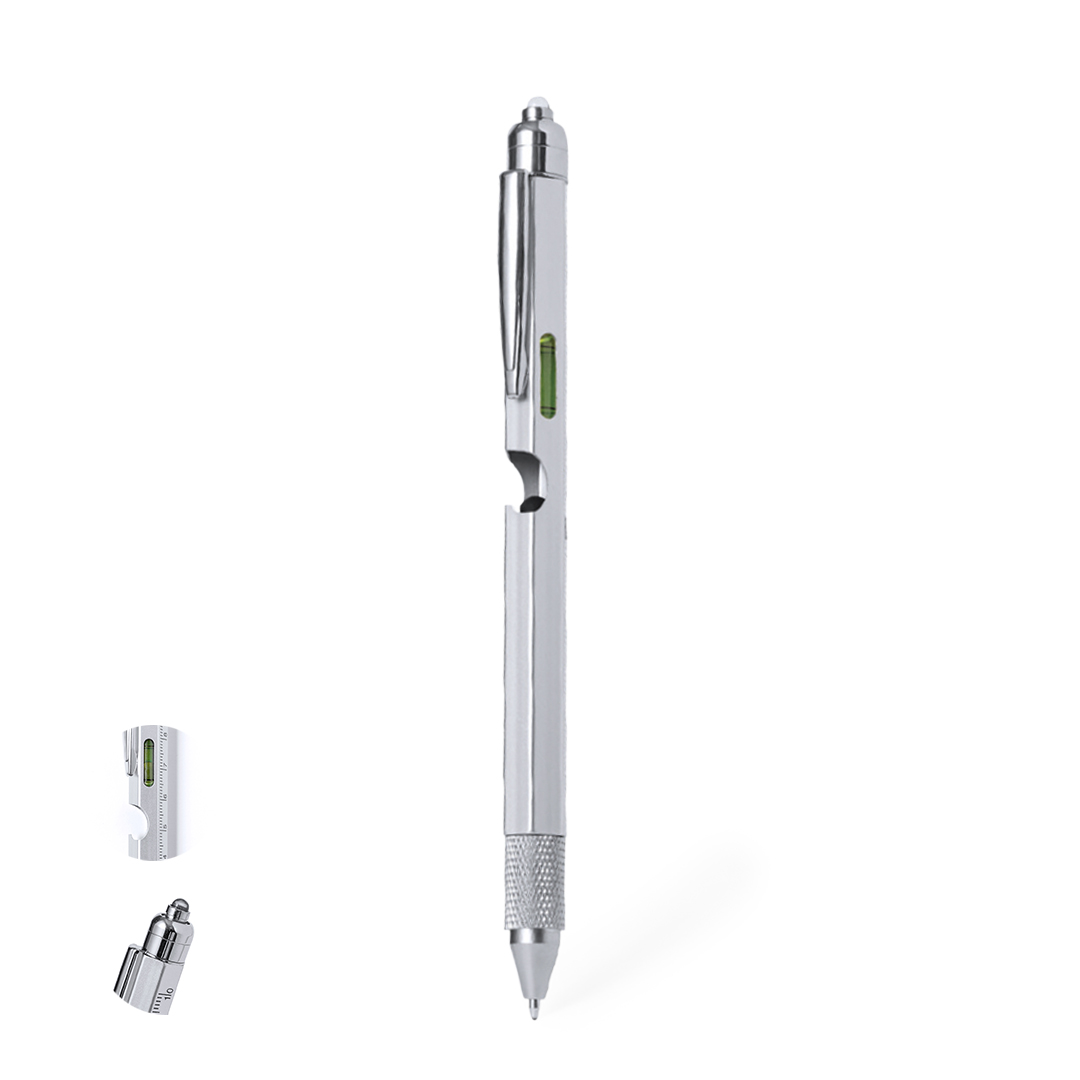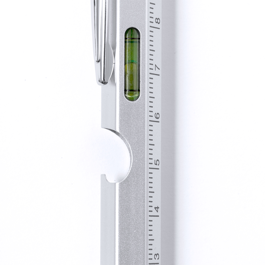 Bolígrafo multifunción 8 en 1 de mecanismo giratorio, fabricado en acero inox. Incluye regla en cm y pulgadas, nivel, abridor, 1 LED alimentado por pila de botón (incluida), puntero, punta plana y philips. Producto de tipo bolígrafo multifunción, pensado para acciones promocionales y uso diario. Este artículo está diseñado para campañas de marca, ferias y regalos corporativos. Destaca por su utilidad práctica y por su buena percepción como soporte publicitario. Permite personalización con logotipo o mensaje, reforzando la visibilidad de la marca. Es una solución versátil que se adapta a diferentes públicos y contextos. Relacionado con los términos: Bolígrafo Multifunción, Escritura, Herramientas, Brico y Automóvil.