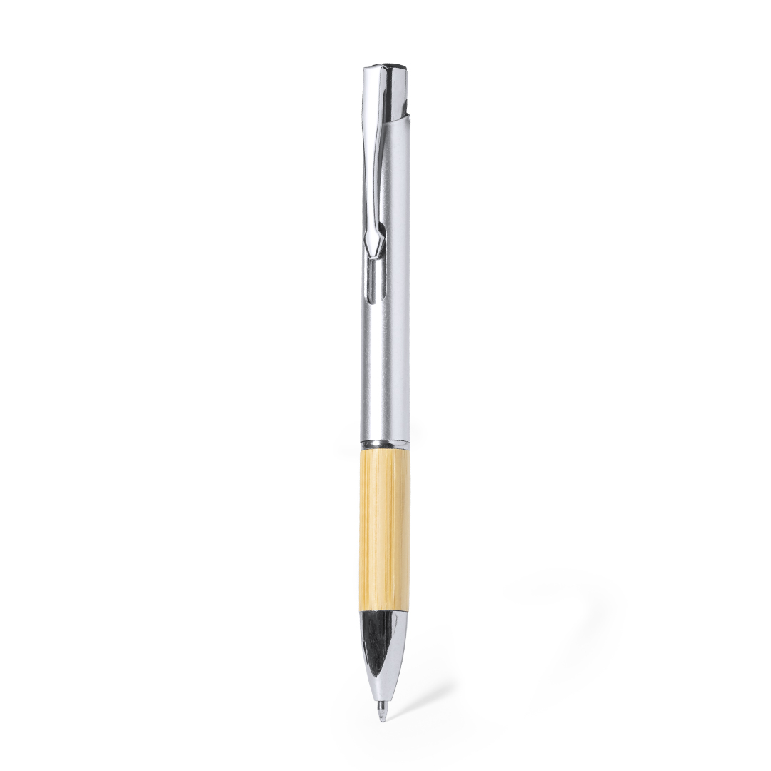 Elegante bolígrafo de línea nature y mecanismo pulsador. Cuerpo en resistente ABS de acabado brillo y empuñadura en bambú, con accesorios a juego. Producto de tipo bolígrafo, pensado para acciones promocionales y uso diario. Este artículo está diseñado para campañas de marca, ferias y regalos corporativos.