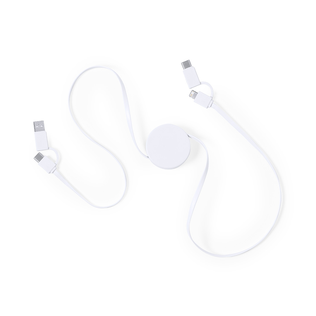 Cargador extensible de diseño ultra compacto. Conexiones Tipo C (entrada y salida), y dual Micro USB/Lightning. Producto de tipo cable cargador, pensado para acciones promocionales y uso diario. Este artículo está diseñado para campañas de marca, ferias y regalos corporativos.