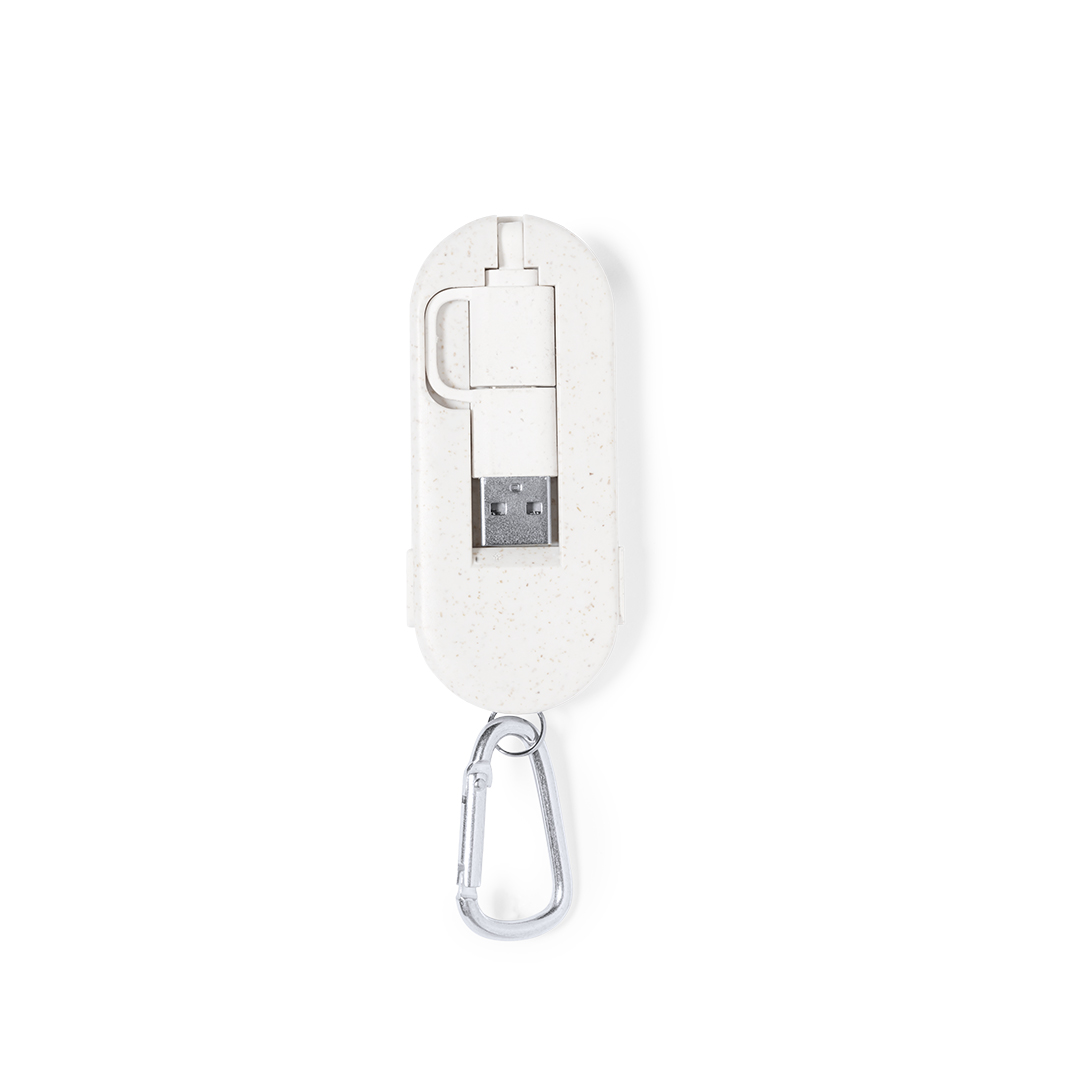 Cable cargador con mosquetón fabricado en fibra de trigo y bambú. Con conexiones de entrada Tipo C y USB y salidas Tipo C, lightning y Micro USB. Producto de tipo cable cargador, pensado para acciones promocionales y uso diario. Este artículo está diseñado para campañas de marca, ferias y regalos corporativos. Destaca por su utilidad práctica y por su buena percepción como soporte publicitario. Permite personalización con logotipo o mensaje, reforzando la visibilidad de la marca. Es una solución versátil que se adapta a diferentes públicos y contextos. Relacionado con los términos: Cable Cargador, Tecnología y Accesorios, Artículos Sostenibles.