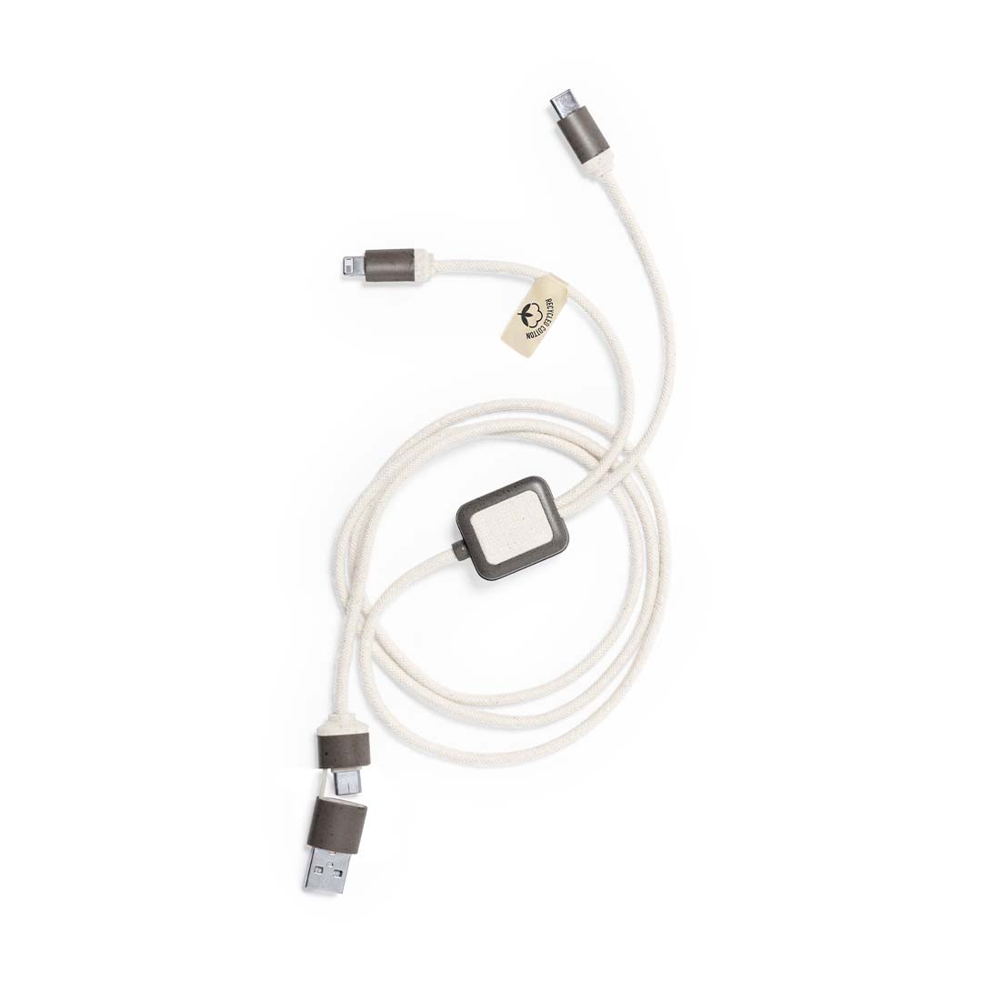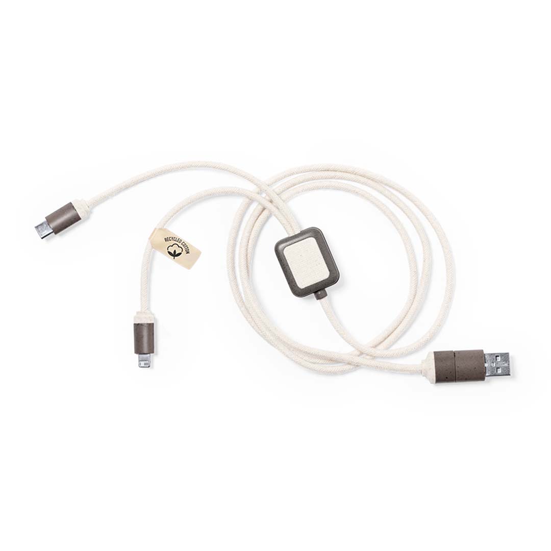 Cable cargador fabricado en fibra de café, con cables recubiertos en algodón reciclado. Conexiones de entrada Tipo C y USB, con salidas Tipo C, Lightning y Micro USB. Producto de tipo cable cargador, pensado para acciones promocionales y uso diario. Este artículo está diseñado para campañas de marca, ferias y regalos corporativos. Destaca por su utilidad práctica y por su buena percepción como soporte publicitario. Permite personalización con logotipo o mensaje, reforzando la visibilidad de la marca. Es una solución versátil que se adapta a diferentes públicos y contextos. Relacionado con los términos: Cable Cargador, Tecnología y Accesorios, Artículos Sostenibles.