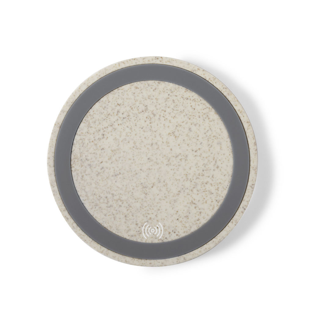 Cargador inalámbrico circular de línea nature. Carcasa en caña de trigo, para así fomentar la utilización de materias primas naturales y reducir las emisiones contaminantes. Producto de tipo cargador, pensado para acciones promocionales y uso diario. Este artículo está diseñado para campañas de marca, ferias y regalos corporativos.