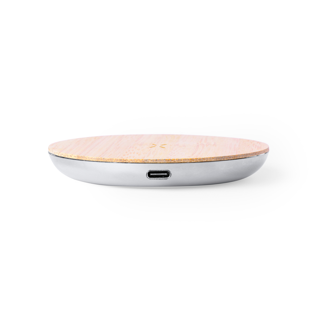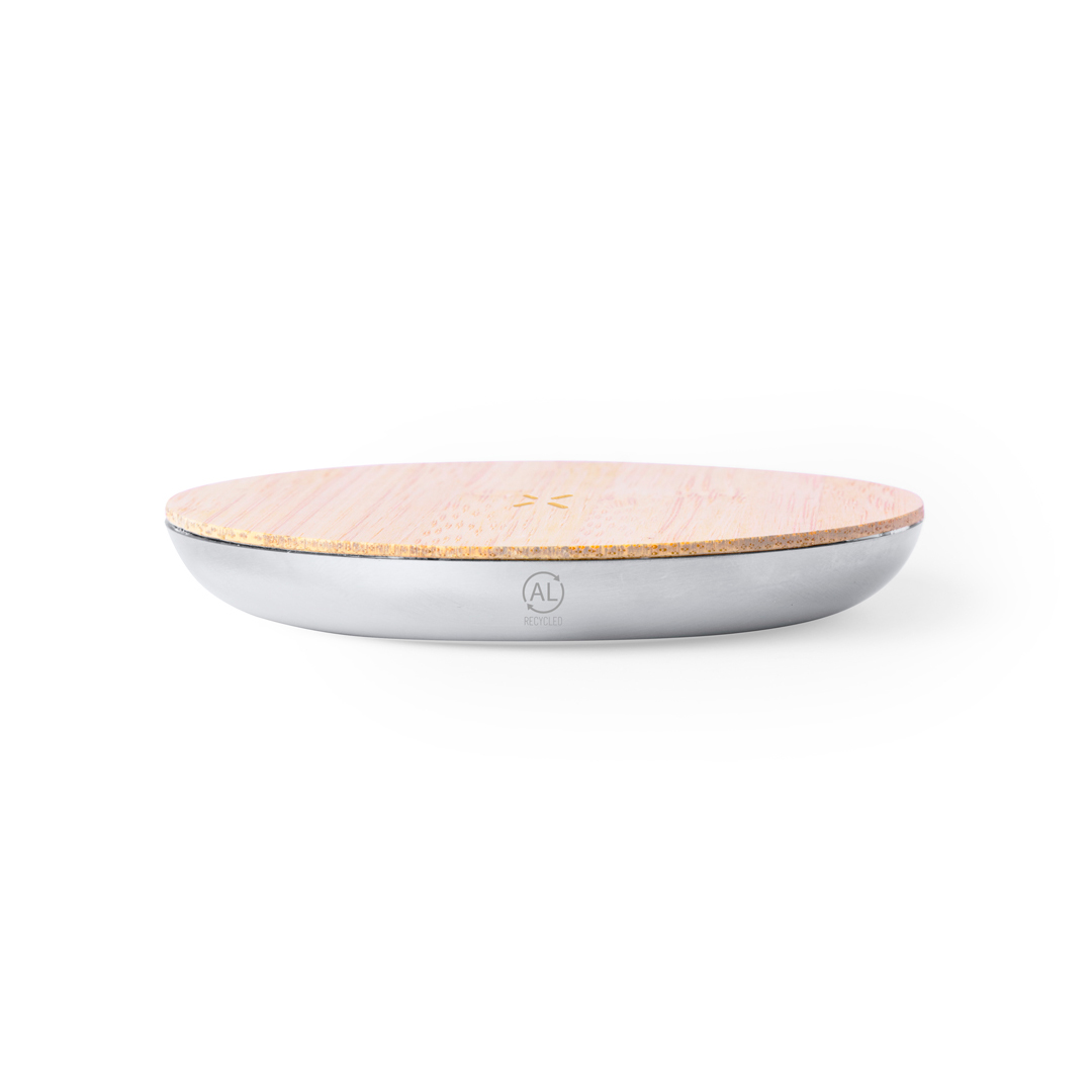 Cargador inalámbrico 15W de diseño circular, con cuerpo fabricado en Aluminio Reciclado y base de carga en bambú. Compatible con dispositivos equipados con tecnología de carga inalámbrica Qi, con cable de carga Tipo C incluido e indicador LED de estado de carga.