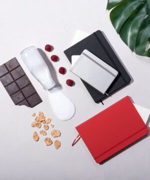 Carpeta de diseño bicolor en vivos colores acabada en suave microfibra y con cierre elástico. Interior a juego con bloc extraíble de 20 hojas lisas, bolsillo de solapa, tarjeteros y soporte para bolígrafo. Producto de tipo carpeta, pensado para acciones promocionales y uso diario.