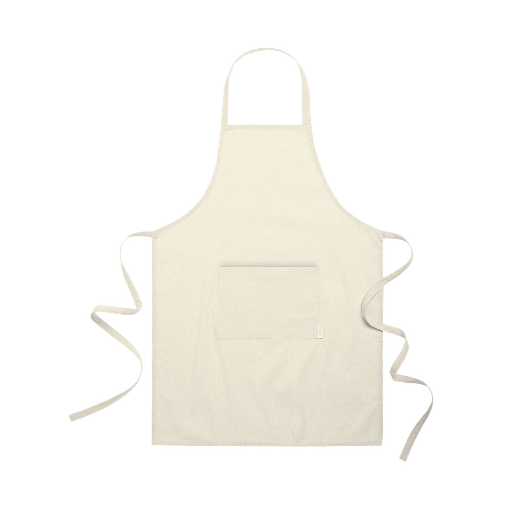 Delantal de línea nature, elaborado en algodón reciclado. Con bolsillo frontal y cintas de ajuste, de corte por debajo de la rodilla. Producto de tipo delantal, pensado para acciones promocionales y uso diario. Este artículo está diseñado para campañas de marca, ferias y regalos corporativos. Destaca por su utilidad práctica y por su buena percepción como soporte publicitario. Permite personalización con logotipo o mensaje, reforzando la visibilidad de la marca. Es una solución versátil que se adapta a diferentes públicos y contextos. Relacionado con los términos: Delantal, Hogar y Decoración, Vino, Accesorios de Bebida y Hostelería, Artículos Sostenibles.