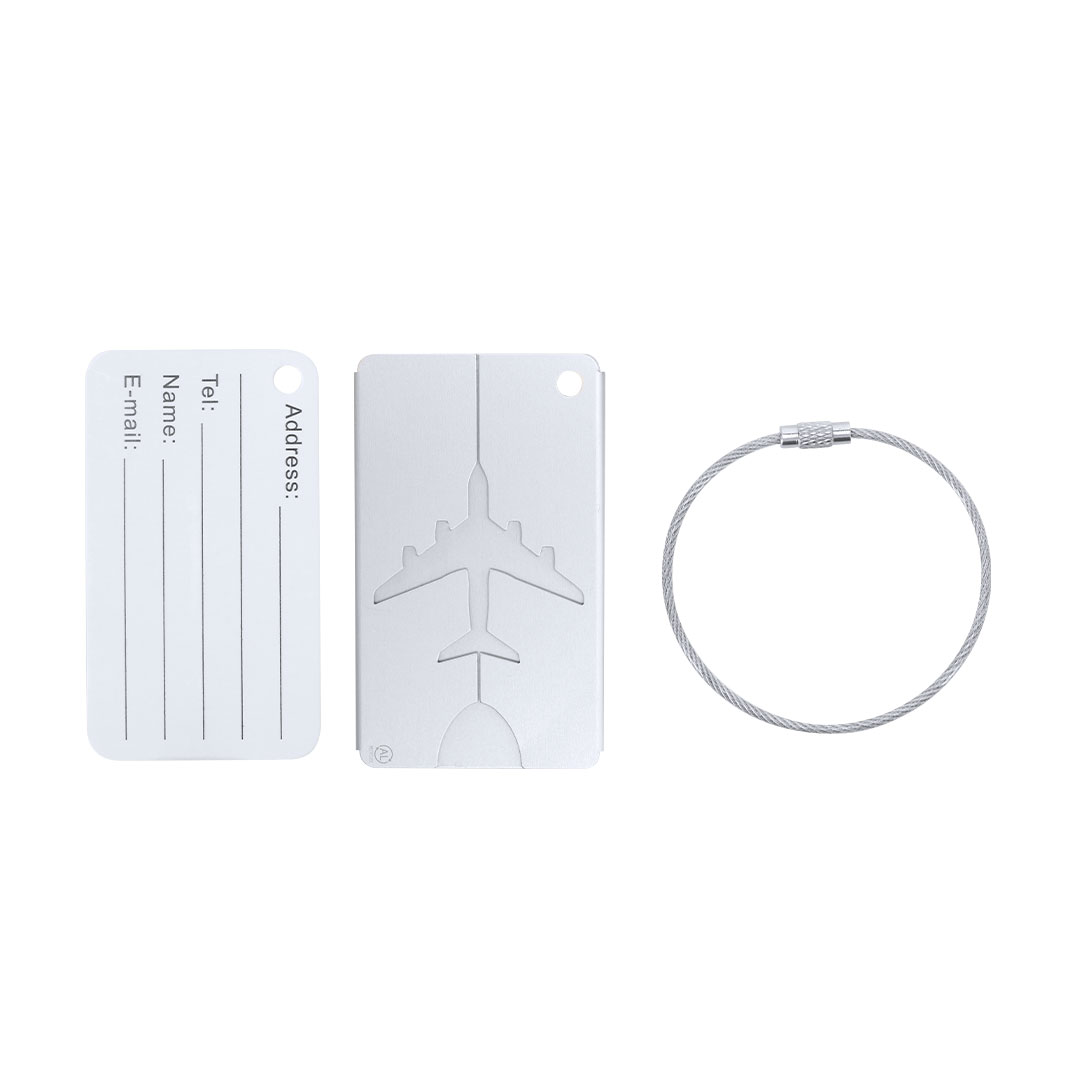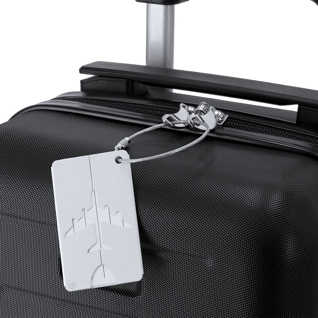Original identificador de maletas con diseño de avión en resistente Aluminio Reciclado. Con cinta de acople en acero inoxidable con sistema de cierra en rosca y tarjeta de identificación en inglés con los siguientes campos impresos; Addres, Tel, Name, E-mail. Producto de tipo identificador maletas, pensado para acciones promocionales y uso diario. Este artículo está diseñado para campañas de marca, ferias y regalos corporativos. Destaca por su utilidad práctica y por su buena percepción como soporte publicitario. Permite personalización con logotipo o mensaje, reforzando la visibilidad de la marca. Es una solución versátil que se adapta a diferentes públicos y contextos. Relacionado con los términos: Identificador Maletas, Viaje.