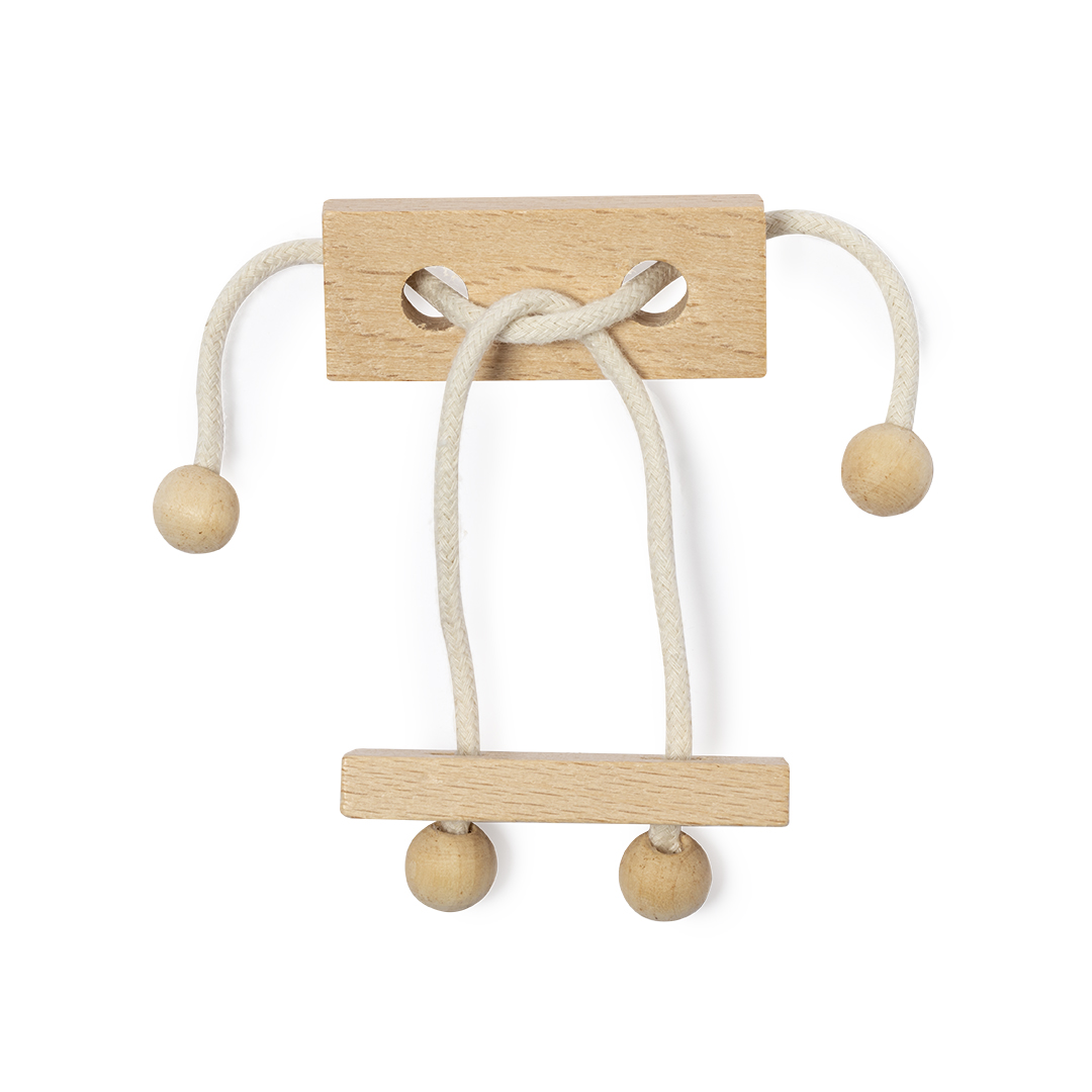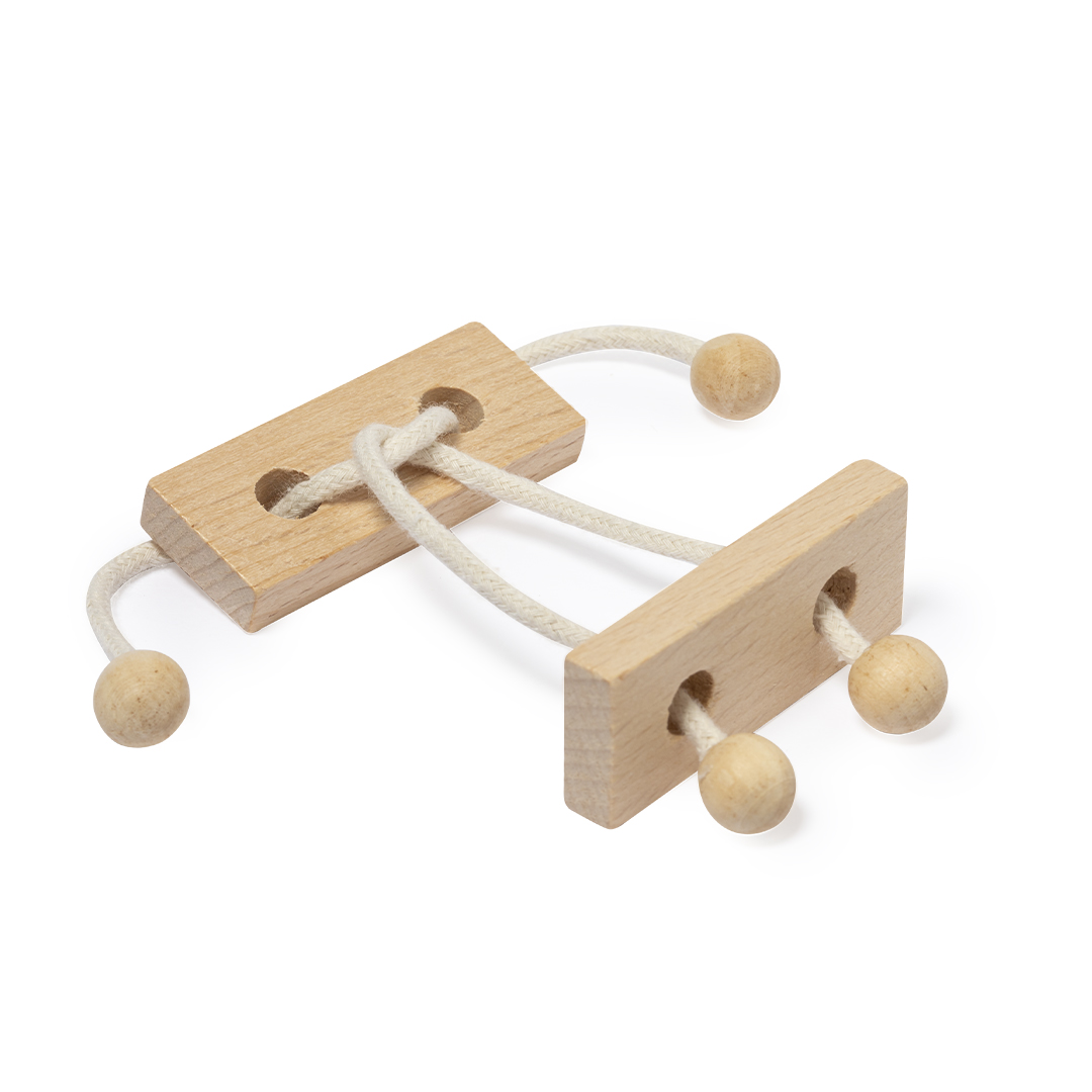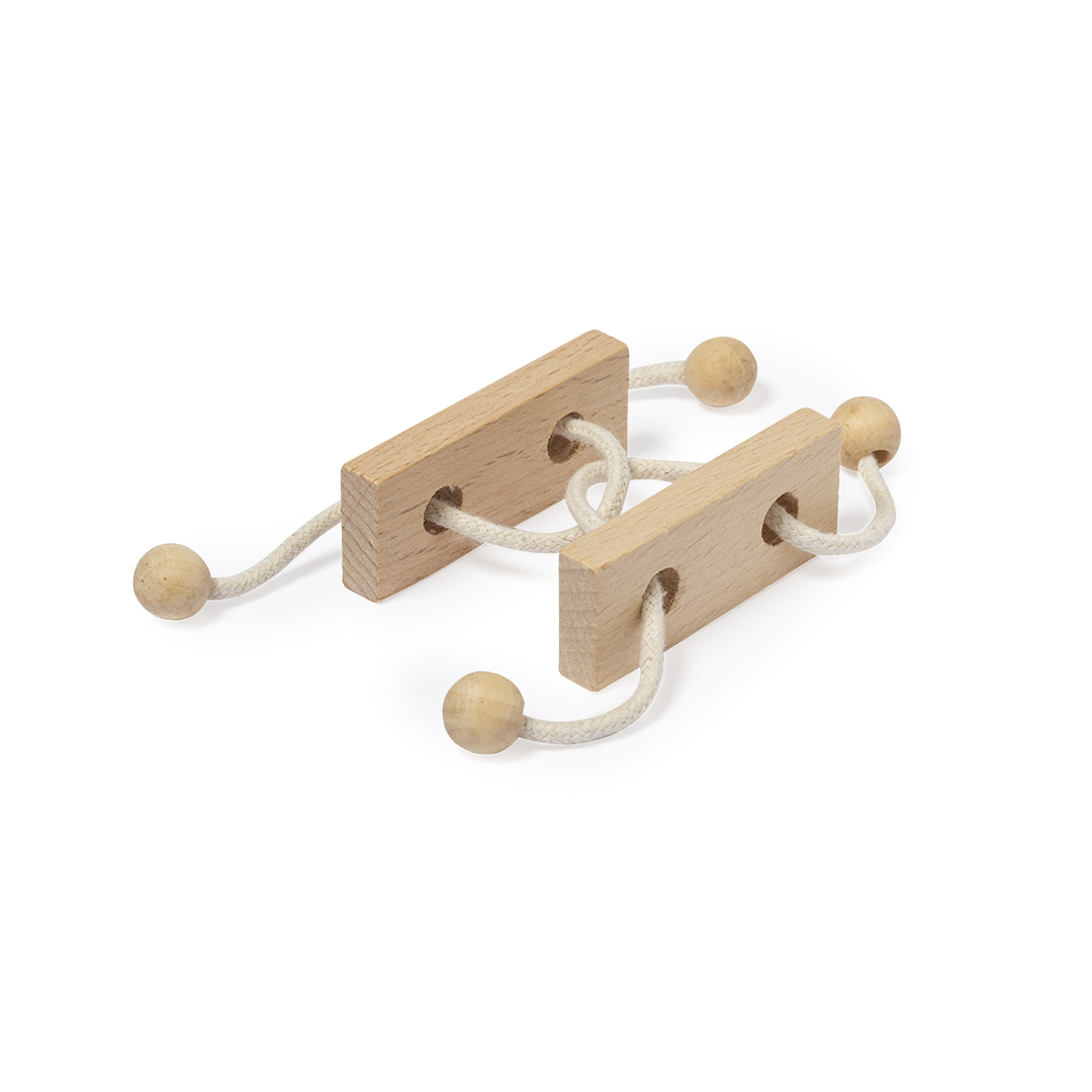 Juego de habilidad de 2 piezas fabricado en madera. Divertido rompecabezas de dos piezas unidas por un cordón de madera, cuyo objetivo es descubrir la forma de separar ambas piezas. Producto de tipo juego habilidad, pensado para acciones promocionales y uso diario. Este artículo está diseñado para campañas de marca, ferias y regalos corporativos. Destaca por su utilidad práctica y por su buena percepción como soporte publicitario. Permite personalización con logotipo o mensaje, reforzando la visibilidad de la marca. Es una solución versátil que se adapta a diferentes públicos y contextos. Relacionado con los términos: Juego Habilidad, Regalos y Premiums, Infantil, Artículos Sostenibles.