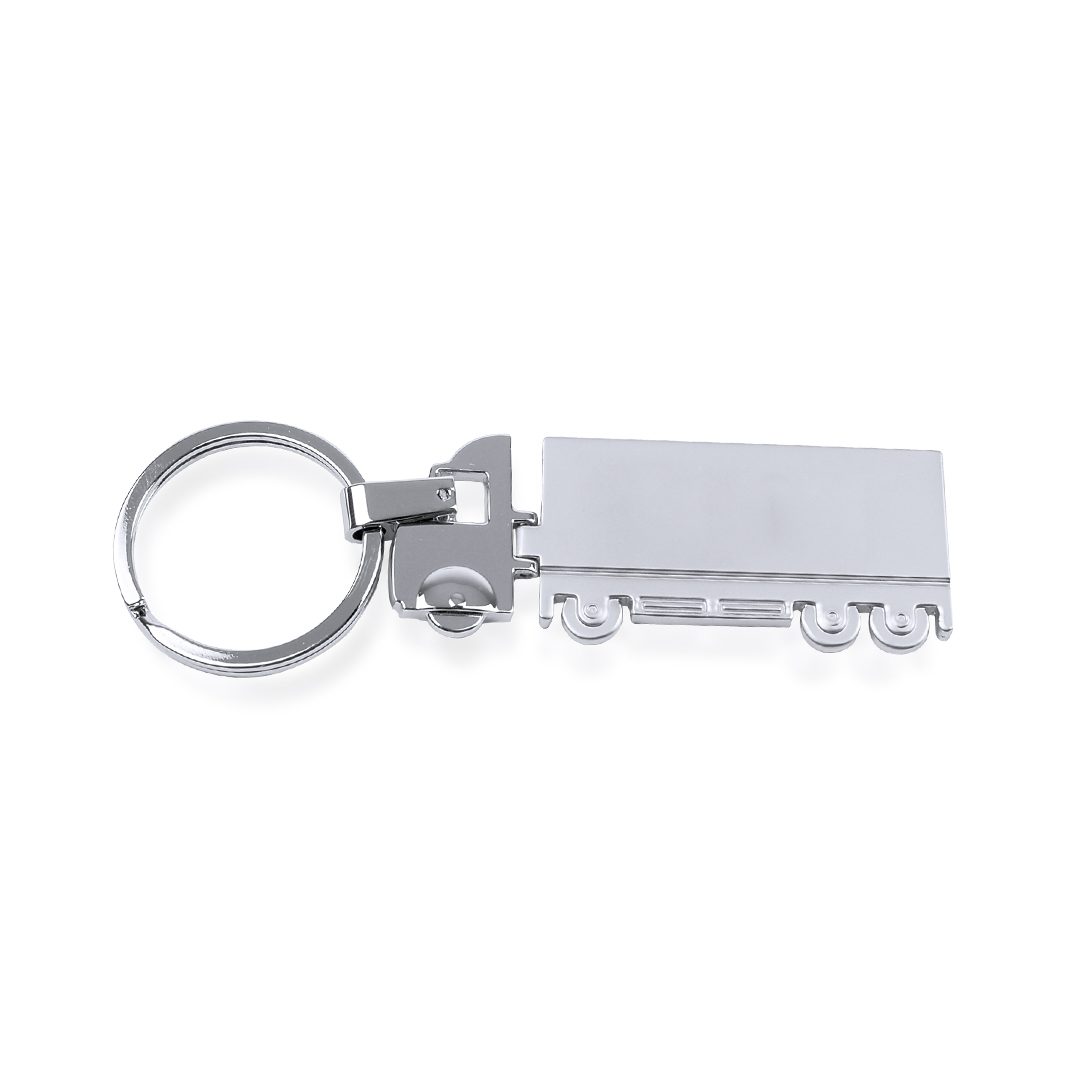 Llavero metálico en divertido diseño de camión especialmente diseñado para marcaje en láser. Con cabina en acabado brillo y remolque en acabado mate. Producto de tipo llavero, pensado para acciones promocionales y uso diario. Este artículo está diseñado para campañas de marca, ferias y regalos corporativos.