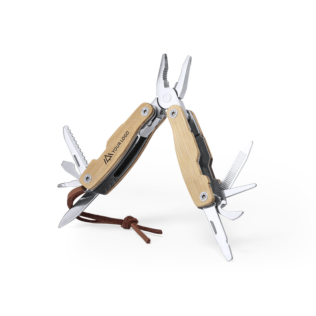 Multiherramienta con resistente cuerpo en acero inox y empuñadura de bambú, con 12 funciones. Incluye cuchillos y navajas destornilladores, limas abridores y alicates. Producto de tipo multiherramienta, pensado para acciones promocionales y uso diario. Este artículo está diseñado para campañas de marca, ferias y regalos corporativos. Destaca por su utilidad práctica y por su buena percepción como soporte publicitario. Permite personalización con logotipo o mensaje, reforzando la visibilidad de la marca. Es una solución versátil que se adapta a diferentes públicos y contextos. Relacionado con los términos: Multiherramienta, Herramientas, Brico y Automóvil, Artículos Sostenibles.