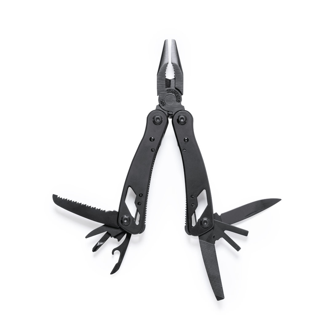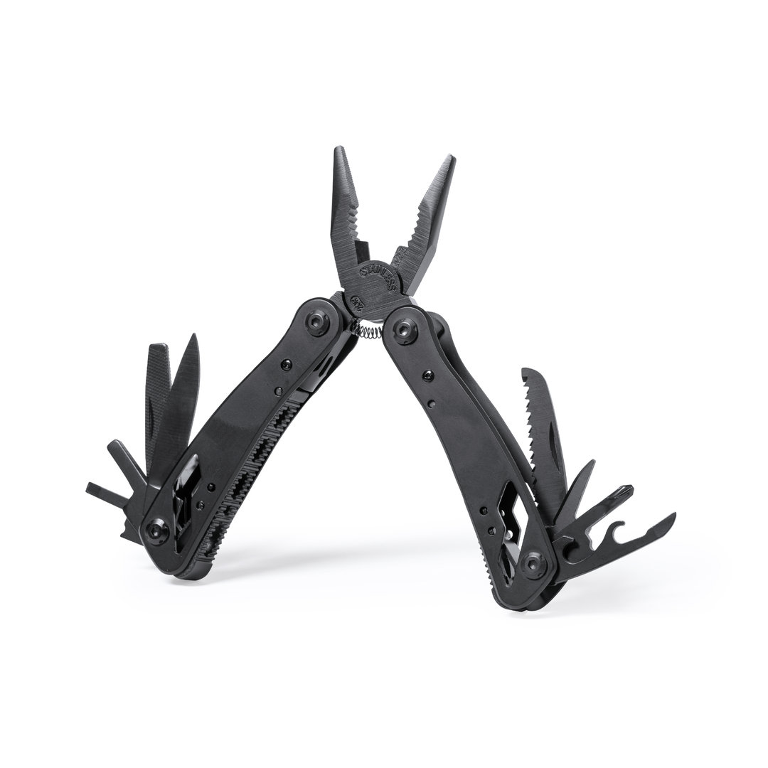 Multiherramienta con accesorios en acero inox de acabado negro y resistente empuñadura a juego en aluminio. Con 13 funciones, entre ellas cuchillo y navaja destornillador, lima abridor y alicates. Producto de tipo multiherramienta, pensado para acciones promocionales y uso diario. Este artículo está diseñado para campañas de marca, ferias y regalos corporativos. Destaca por su utilidad práctica y por su buena percepción como soporte publicitario. Permite personalización con logotipo o mensaje, reforzando la visibilidad de la marca. Es una solución versátil que se adapta a diferentes públicos y contextos. Relacionado con los términos: Multiherramienta, Herramientas, Brico y Automóvil.