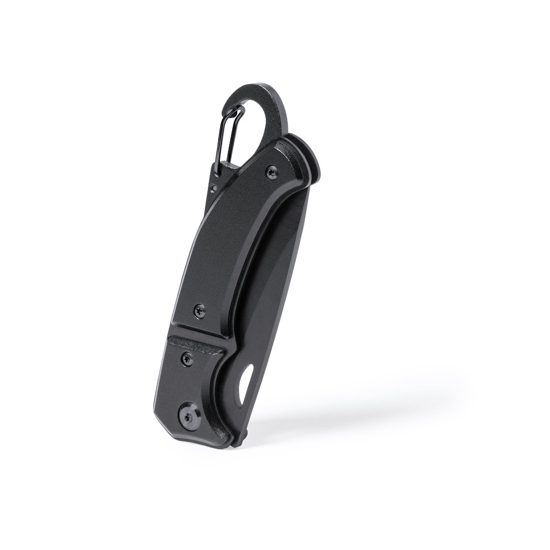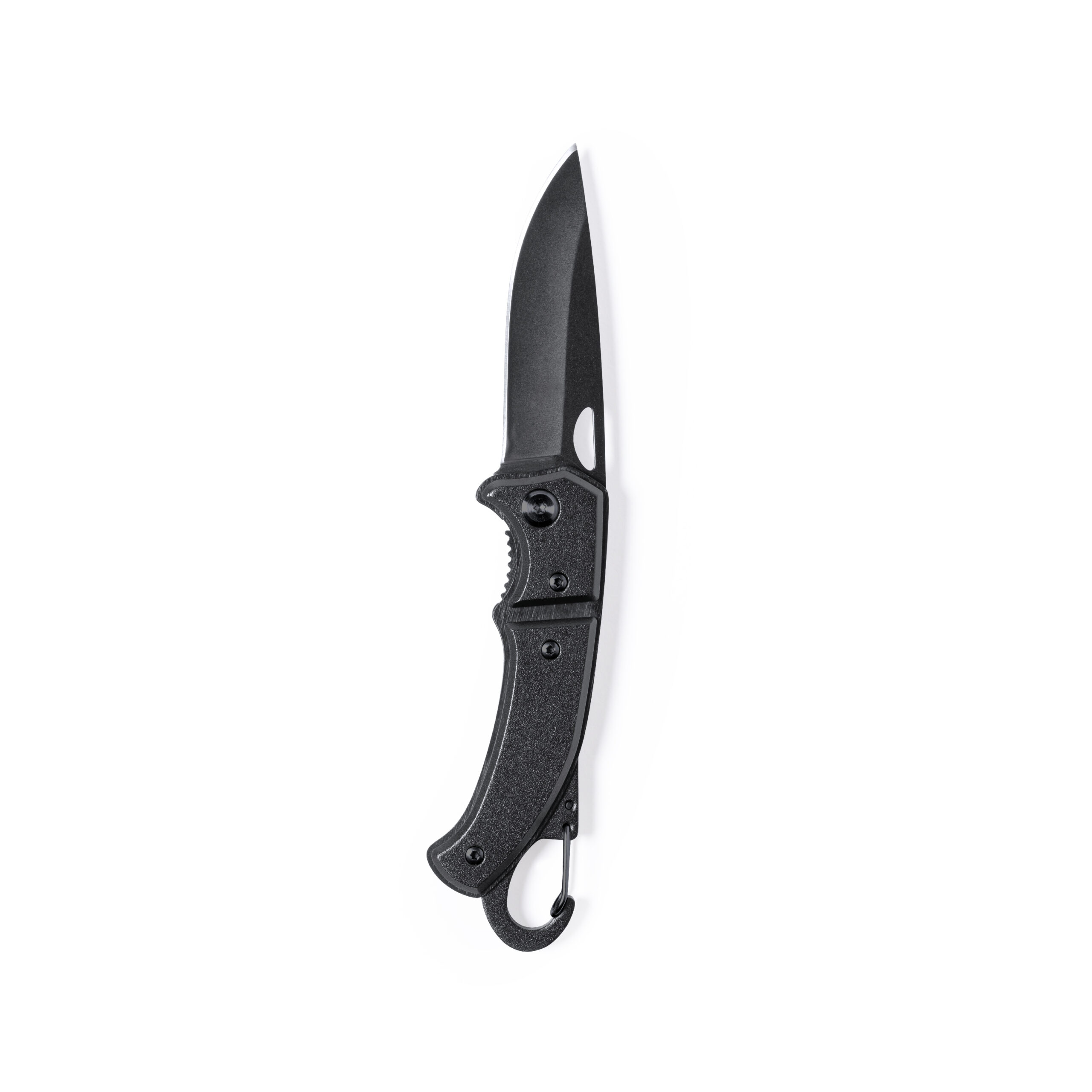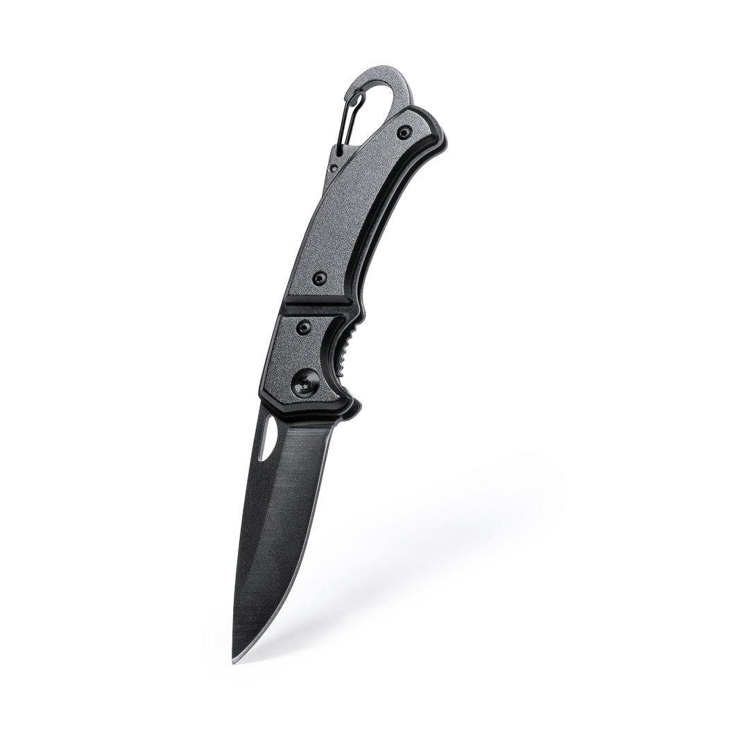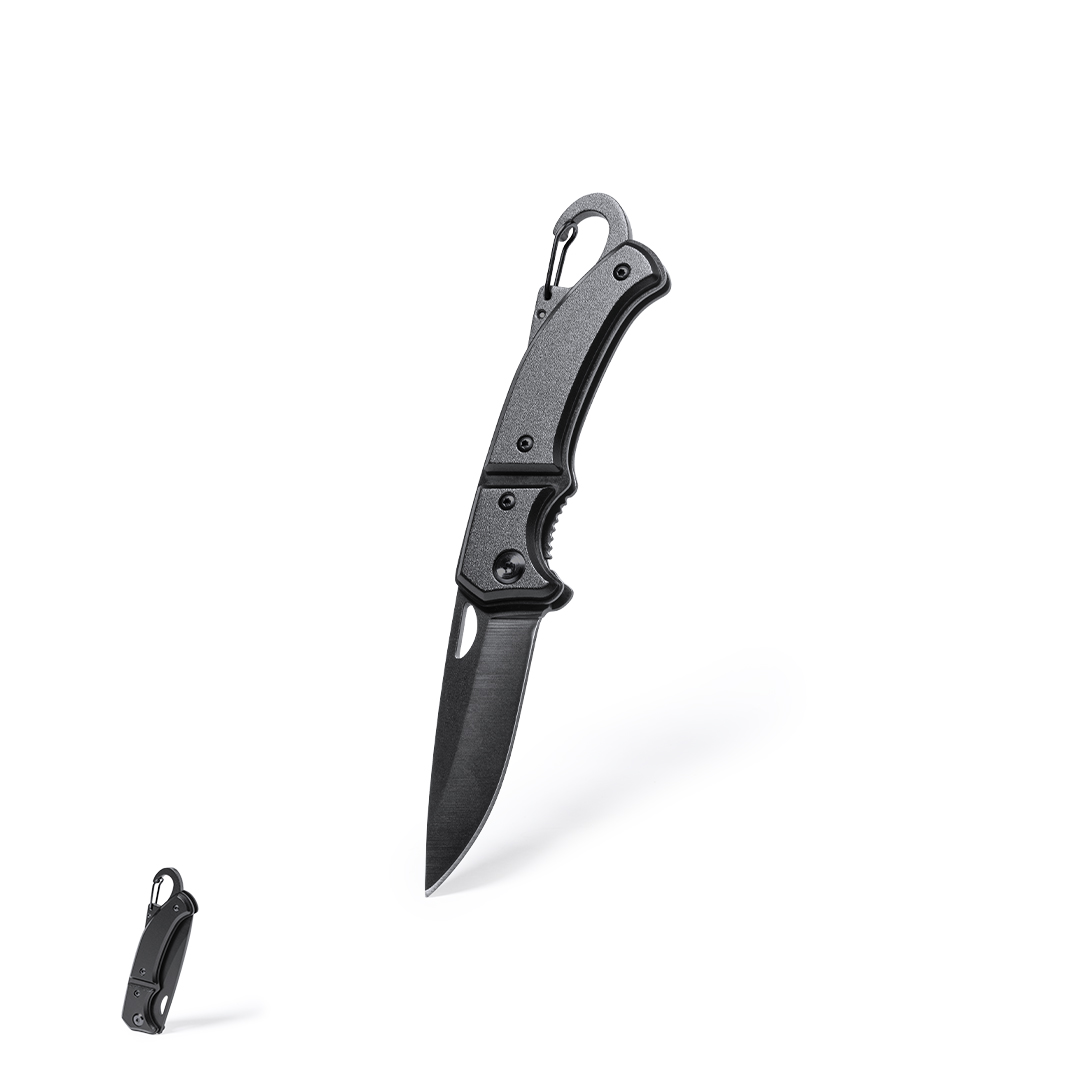 Navaja con hoja en acero inox de acabado negro y resistente empuñadura a juego en aluminio. Con mosquetón integrado en mango y bloqueo de seguridad. Producto de tipo navaja, pensado para acciones promocionales y uso diario. Este artículo está diseñado para campañas de marca, ferias y regalos corporativos.