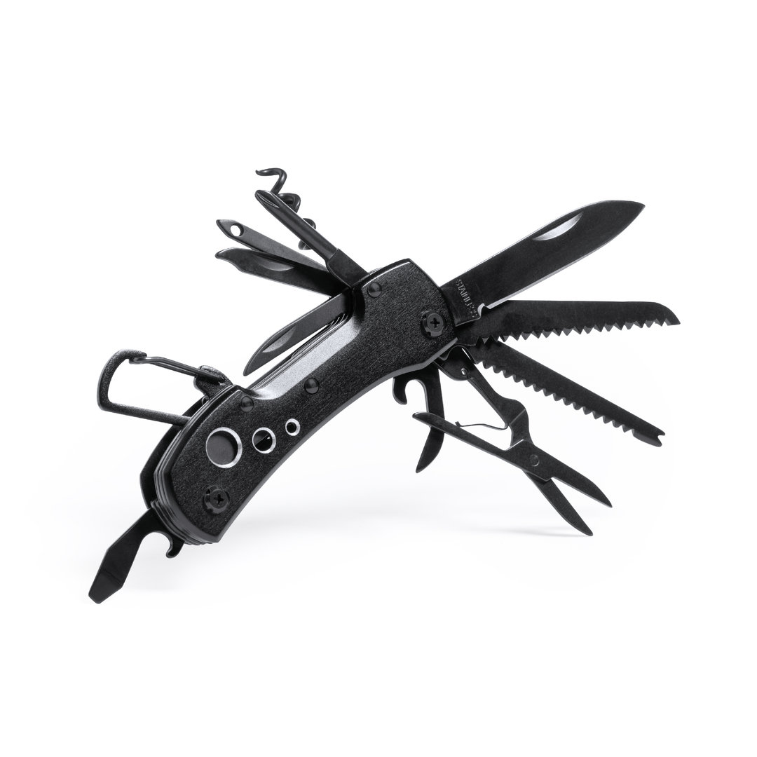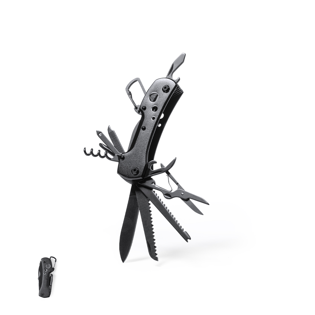 Navaja multiusos con accesorios en acero inox de acabado negro y resistente empuñadura a juego en aluminio, con mosquetón integrado en mango. 13 funciones, entre ellas cuchillo y navaja destornillador, lima abridor y tijeras. Producto de tipo navaja multiusos, pensado para acciones promocionales y uso diario. Este artículo está diseñado para campañas de marca, ferias y regalos corporativos. Destaca por su utilidad práctica y por su buena percepción como soporte publicitario. Permite personalización con logotipo o mensaje, reforzando la visibilidad de la marca. Es una solución versátil que se adapta a diferentes públicos y contextos. Relacionado con los términos: Navaja Multiusos, Herramientas, Brico y Automóvil.