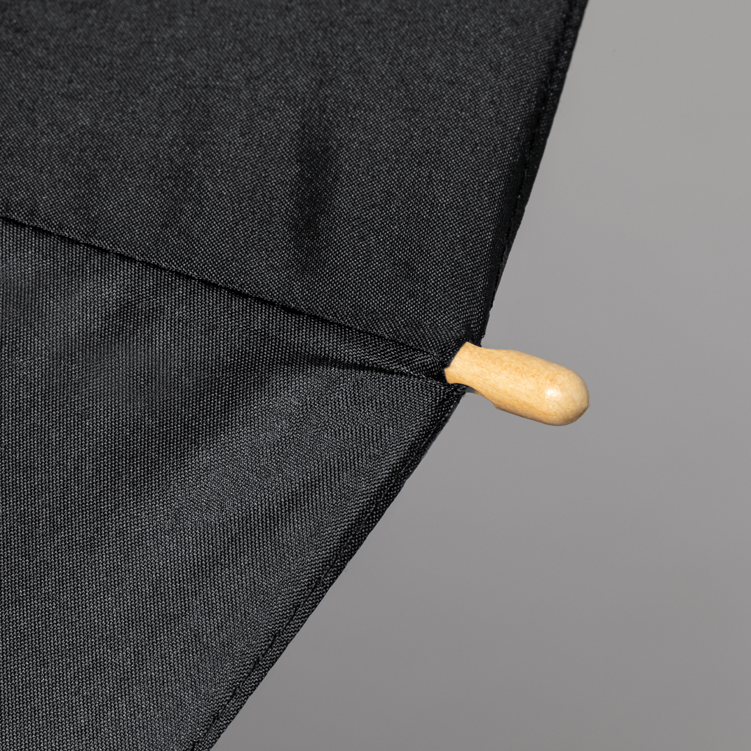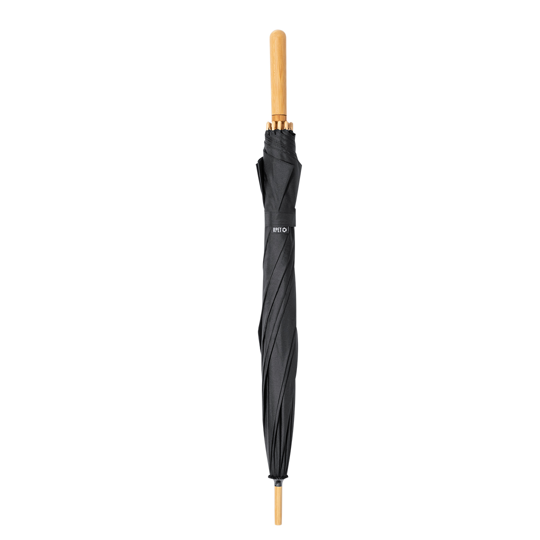 Paraguas de 140cm de diámetro en material pongee 190T RPET. Apertura manual y varillas de fibra de vidrio antiviento, de elegante color negro con cierre de velcro. Producto de tipo paraguas, pensado para acciones promocionales y uso diario. Este artículo está diseñado para campañas de marca, ferias y regalos corporativos.