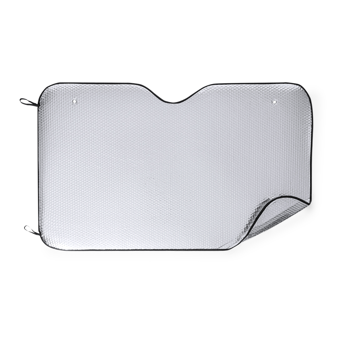Parasol en aluminio con burbuja en ambas caras en color plateado de acabado metalizado con ribetes en color negro. De tamaño 130x80cm, con argollas metálicas de refuerzo, cintas elásticas para plegado, dos ventosas para ajuste en luna y presentación desplegado en plancha para fácil impresión. Producto de tipo parasol, pensado para acciones promocionales y uso diario. Este artículo está diseñado para campañas de marca, ferias y regalos corporativos. Destaca por su utilidad práctica y por su buena percepción como soporte publicitario. Permite personalización con logotipo o mensaje, reforzando la visibilidad de la marca. Es una solución versátil que se adapta a diferentes públicos y contextos. Relacionado con los términos: Parasol,.