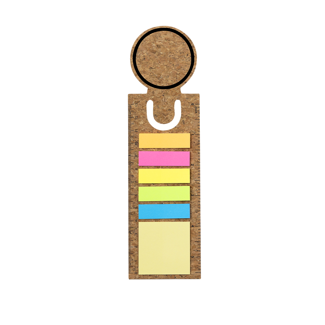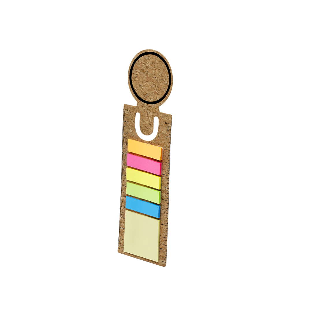 Regla marcapáginas de corcho con notas adhesivas. Incluye 90 notas adhesivas en variados colores y tamaños.Elaborado con elementos vegetales para así fomentar la utilización de materias primas naturales y reducir las emisiones contaminantes. Producto de tipo regla marcapáginas, pensado para acciones promocionales y uso diario.