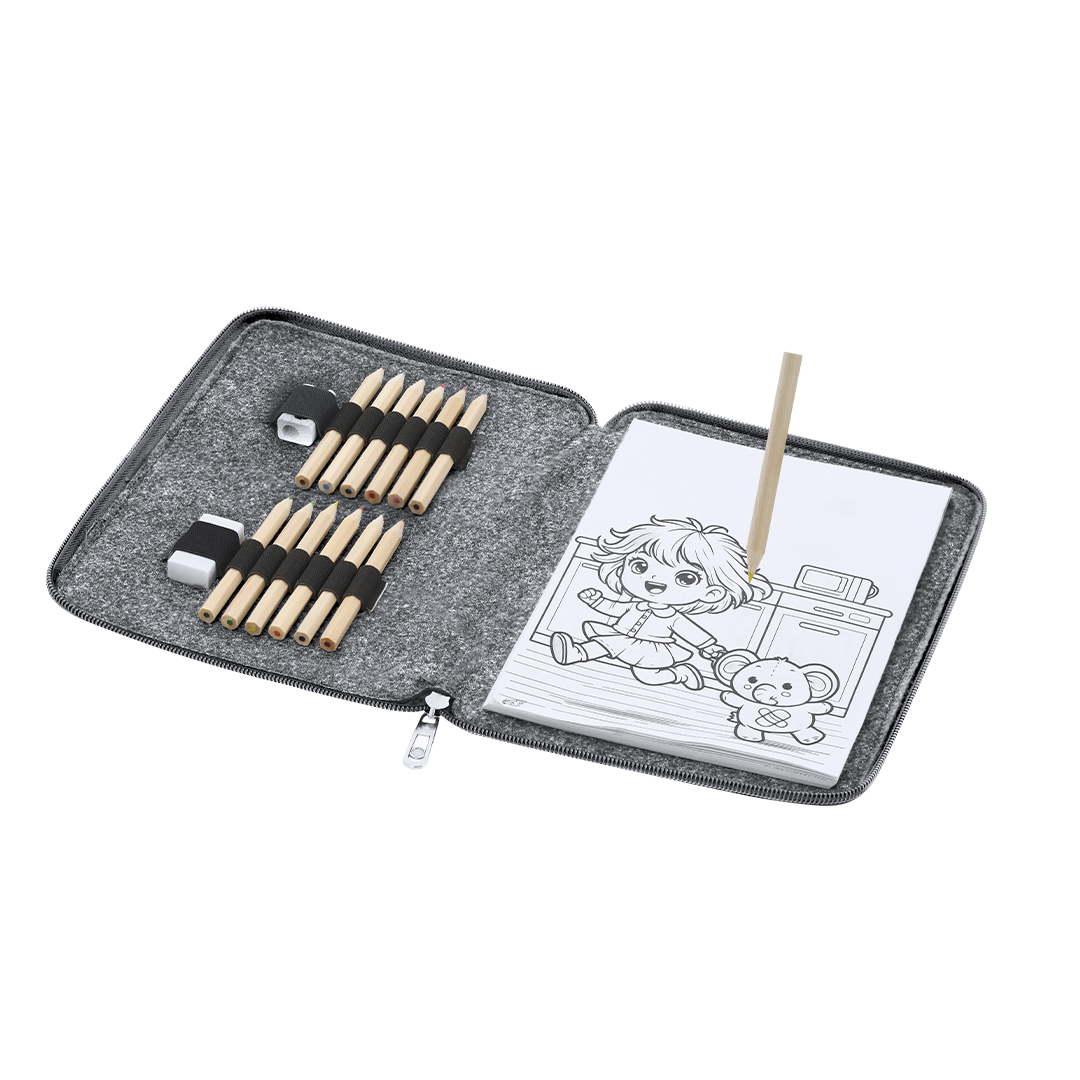Set de lápices de colores en estuche fabricado en Fieltro RPET. Incluye 11 lápices en diferentes colores de forma hexagonal, 1 goma de borrar, 1 sacapuntas de madera y 60 hojas con divertidos diseños en blanco y negro para colorear.
