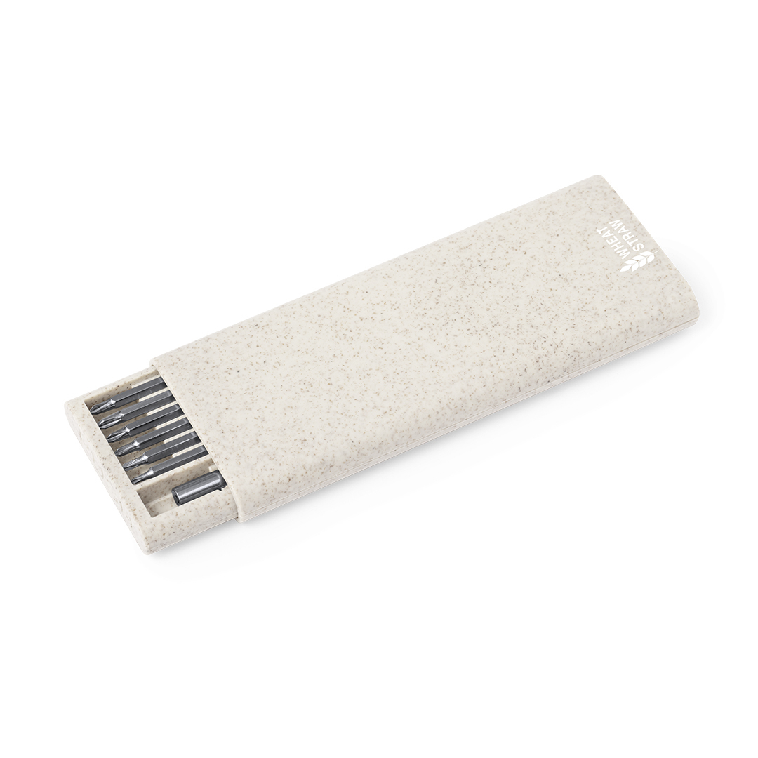 Práctico set de herramientas fabricado en caña de trigo y troquelado interior para un perfecto ajuste. Incluye un destornillador de precisión con 24 accesorios, compuesto por diversas puntas: philips, allen y planas. Producto de tipo set herramientas, pensado para acciones promocionales y uso diario. Este artículo está diseñado para campañas de marca, ferias y regalos corporativos. Destaca por su utilidad práctica y por su buena percepción como soporte publicitario. Permite personalización con logotipo o mensaje, reforzando la visibilidad de la marca. Es una solución versátil que se adapta a diferentes públicos y contextos. Relacionado con los términos: Set Herramientas, Herramientas, Brico y Automóvil, Artículos Sostenibles.