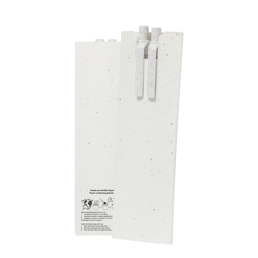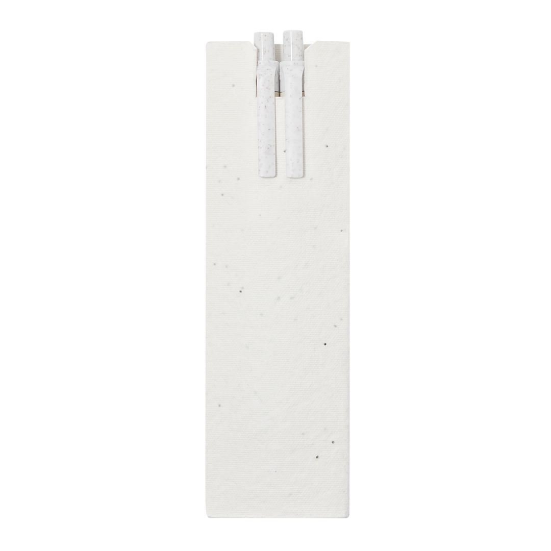 Set de bolígrafo y lápiz eterno fabricados con cartones de leche reciclados, presentados en funda de papel con semillas. Bolígrafo de tinta azul y lápiz con punta eterna, para así usar siempre el mismo lápiz y no generar residuos, ambos con mecanismo pulsador y clip a juego fabricados en Caña de Trigo, con distintivo grabado. Producto de tipo set, pensado para acciones promocionales y uso diario. Este artículo está diseñado para campañas de marca, ferias y regalos corporativos. Destaca por su utilidad práctica y por su buena percepción como soporte publicitario. Permite personalización con logotipo o mensaje, reforzando la visibilidad de la marca. Es una solución versátil que se adapta.