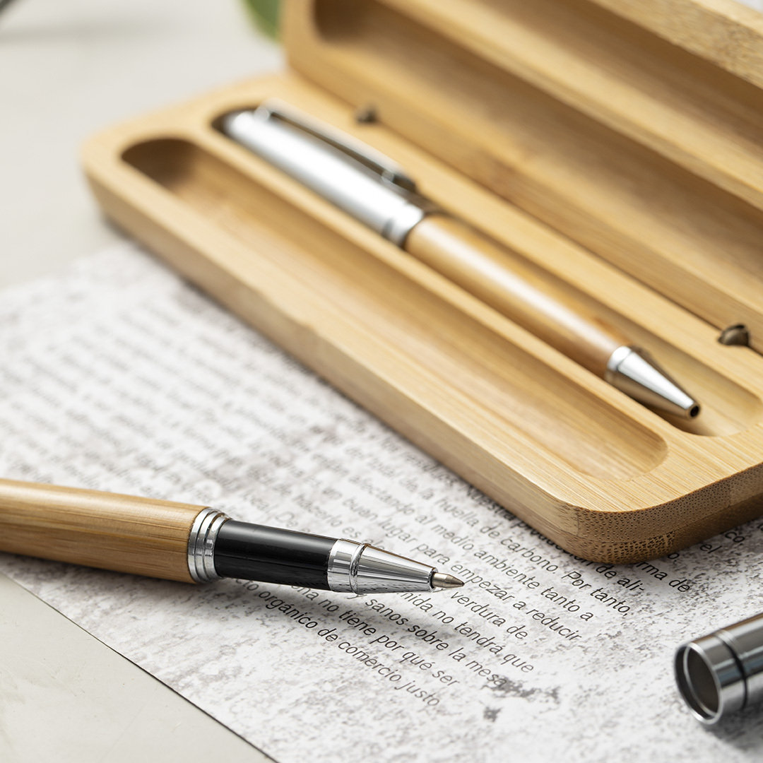 Set de bolígrafo y roller de línea nature. Fabricado en combinación de bambú con metal, para así fomentar la utilización de materias primas naturales y reducir las emisiones contaminantes. Producto de tipo set, pensado para acciones promocionales y uso diario. Este artículo está diseñado para campañas de marca, ferias y regalos corporativos. Destaca por su utilidad práctica y por su buena percepción como soporte publicitario. Permite personalización con logotipo o mensaje, reforzando la visibilidad de la marca. Es una solución versátil que se adapta a diferentes públicos y contextos. Relacionado con los términos: Set, Escritura, Artículos Sostenibles.