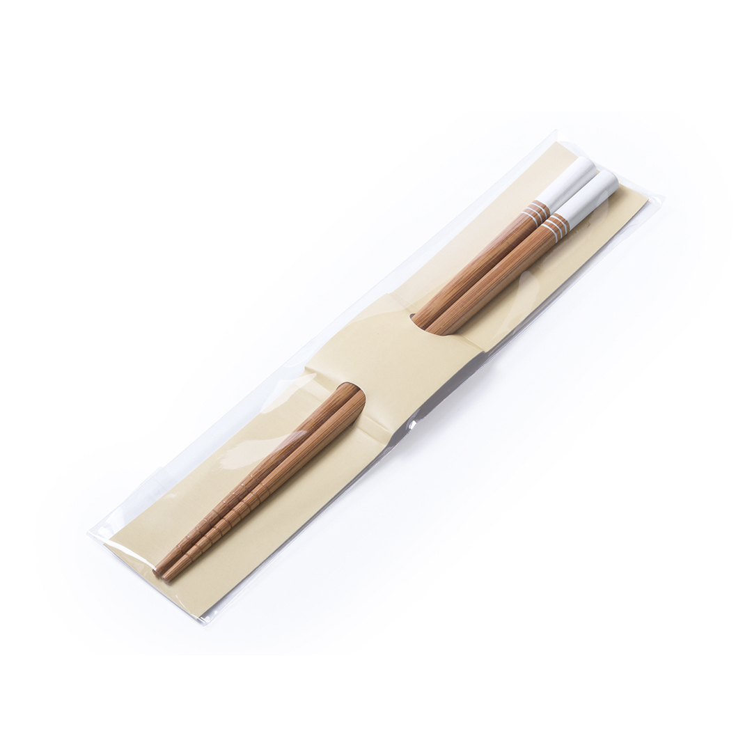 Set de 2 palillos de bambú de fino acabado con accesorios en sobrios colores. Presentados en funda individual de cartón con troquelado. Producto de tipo set palillos, pensado para acciones promocionales y uso diario. Este artículo está diseñado para campañas de marca, ferias y regalos corporativos.