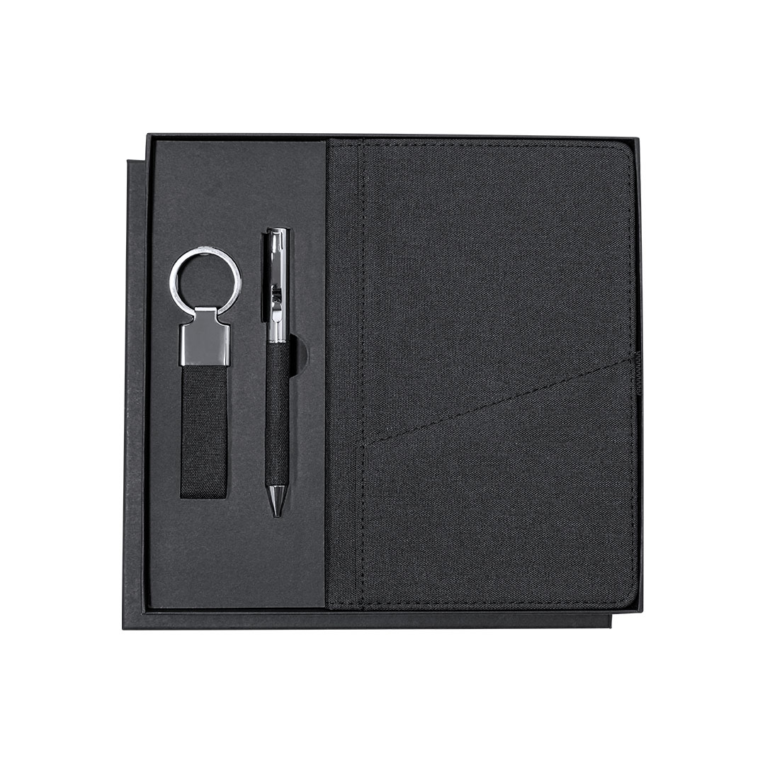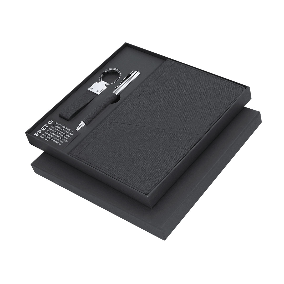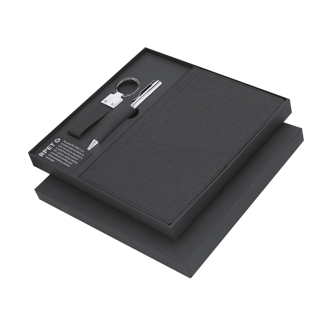Elegante set premium que incluye:Bloc de notas en RPET en elegante color negro. Incluye cierre elástico, bolsillo frontal y marcapáginas de tela. Producto de tipo set, pensado para acciones promocionales y uso diario. Este artículo está diseñado para campañas de marca, ferias y regalos corporativos. Destaca por su utilidad práctica y por su buena percepción como soporte publicitario. Permite personalización con logotipo o mensaje, reforzando la visibilidad de la marca. Es una solución versátil que se adapta a diferentes públicos y contextos. Relacionado con los términos: Set, Oficina y Negocios, Regalos y Premiums.