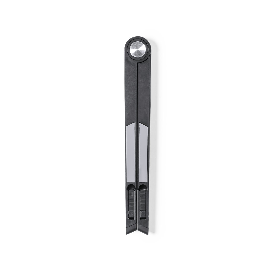 Original soporte plegable para dispositivos móviles y ordenador portátil de hasta 13″, fabricado en resistente material ABS. Con dos posiciones de visionado y plegado de pequeño tamaño para un fácil transporte. Producto de tipo soporte, pensado para acciones promocionales y uso diario.